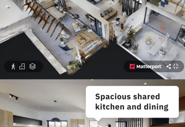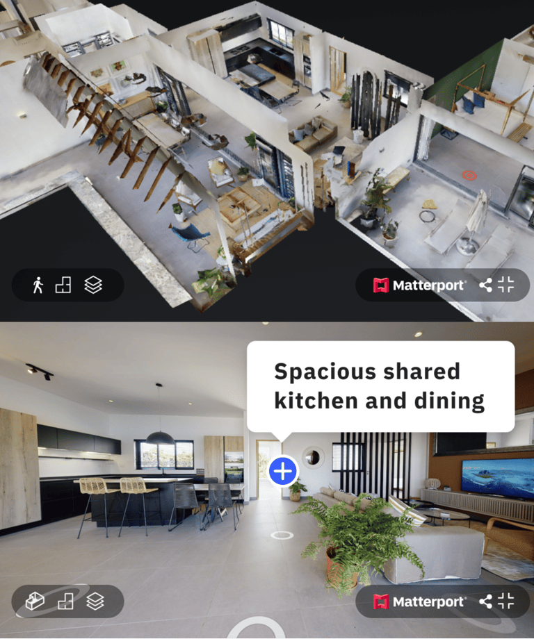 Interactive 360° home tours with navigation, floor plan tags, and mobile compatibility.